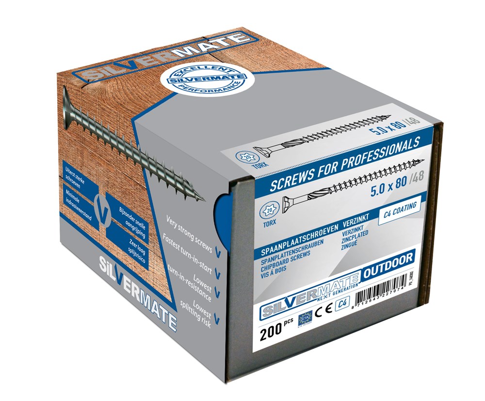 - SilverMate Next generation schroeven hebben door de speciale milling thread bij de punt, een laag splijtrisico wanneer de schroef nabij het kopse einde van een plank of lat wordt gebruikt.